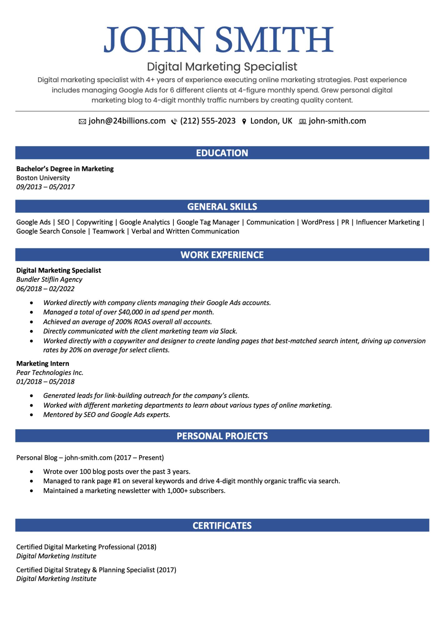 Digital Marketing Resume Example